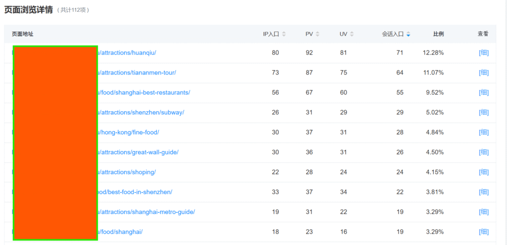 下圖共有112條頁面獲得了來自谷歌的自然流量,但其中只有前十頁在單日獲得了十次以上的流量。